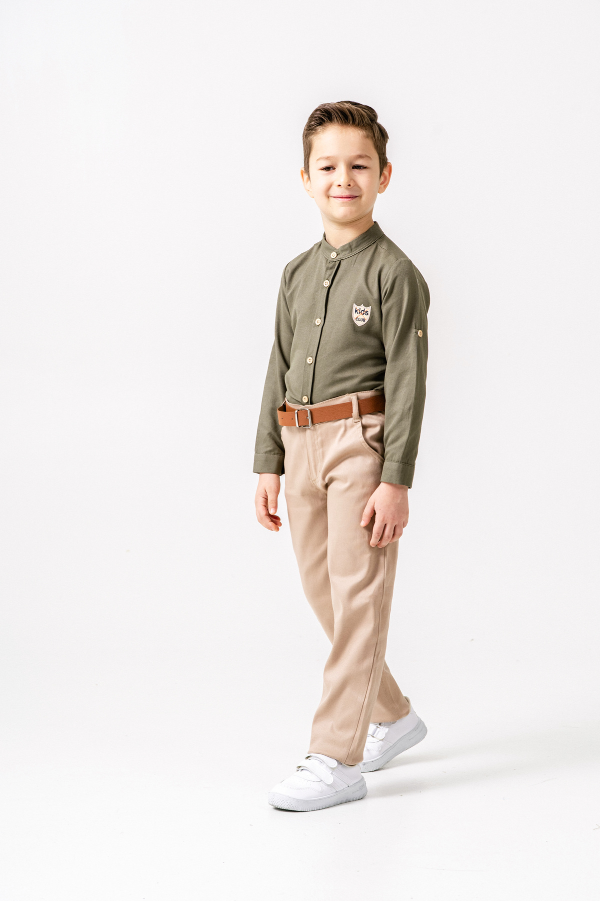 hakim yaka gömlek, pantolon ve şık bir kemer yer alıyor.