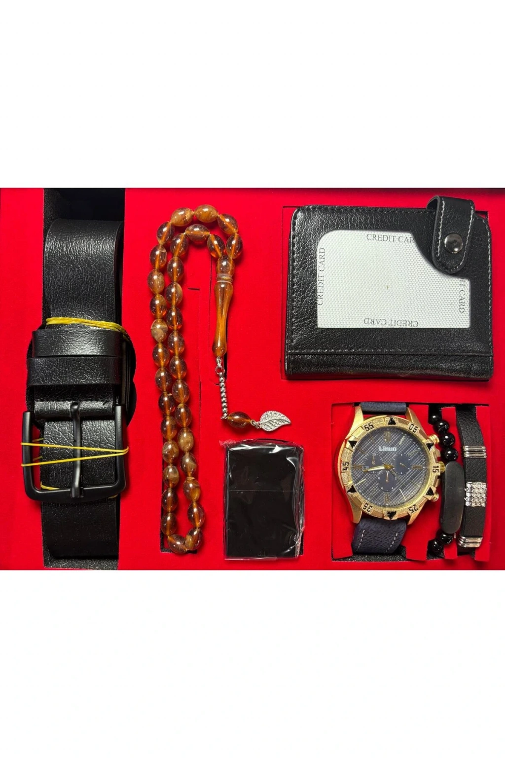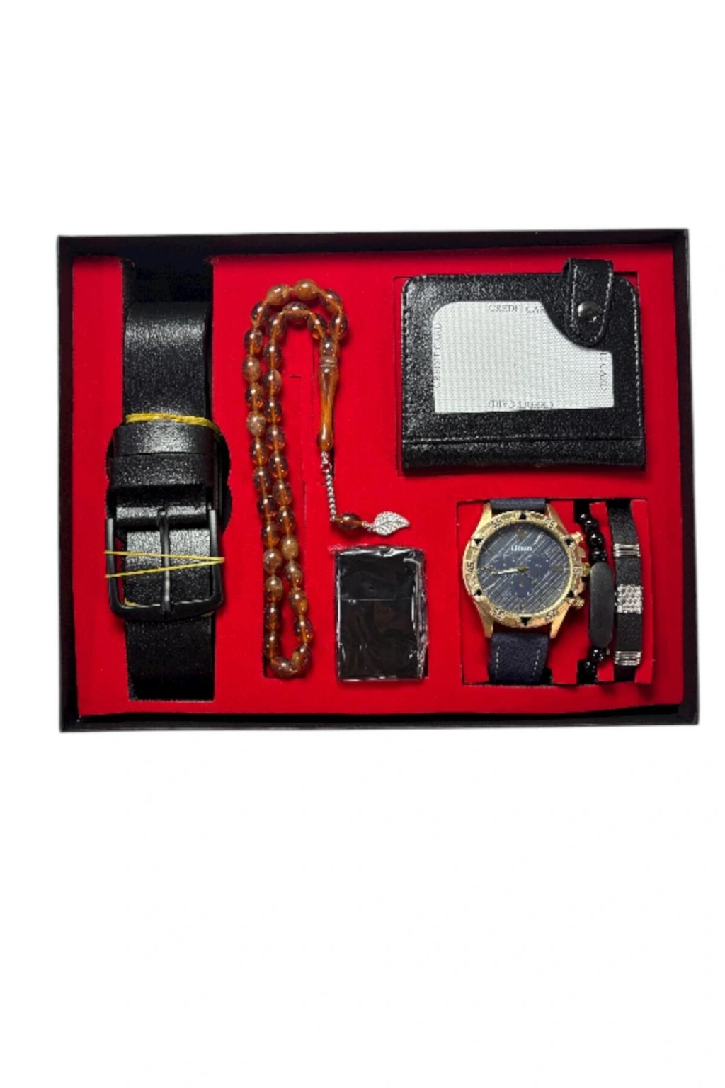 - Türkiye'de üretilmiş, kaliteli işçilikle hazırlanmış erkek kol saati, kartlık, çakmak, kemer ve bileklik set.; - Sade ve şık tasarımıyla dikkat çeken düz desenli ürünler, her türlü kıyafetle uyum sağlar.; - Günlük kullanım için ideal olan bu set, hem şıklığı hem de fonksiyonelliği bir arada sunar.;