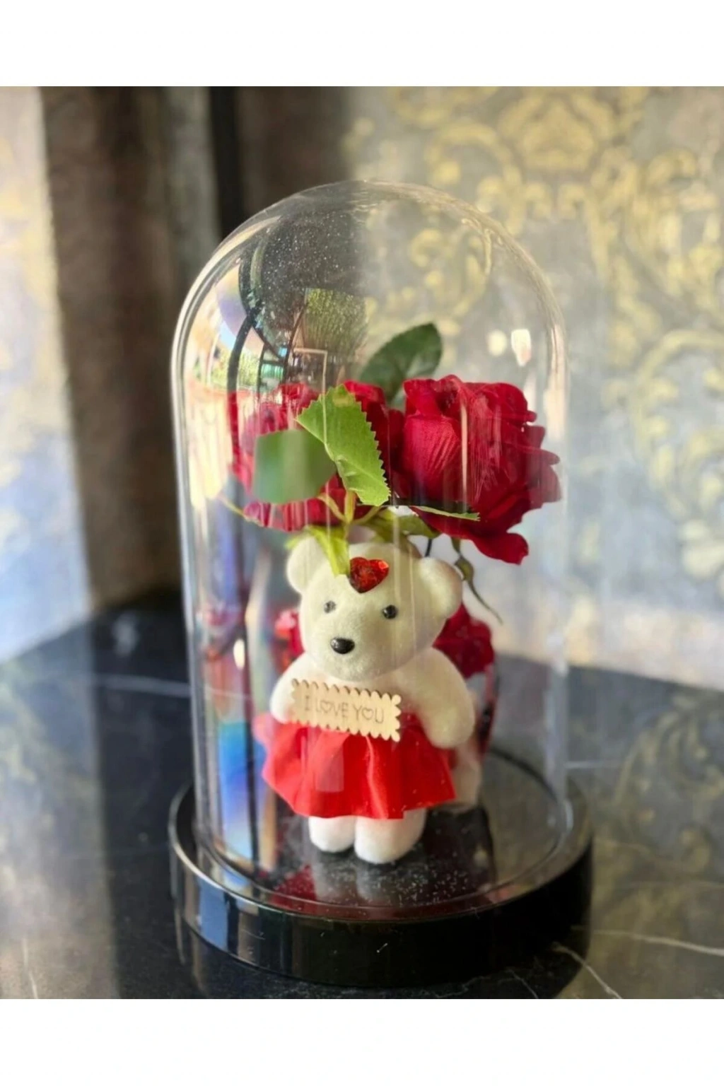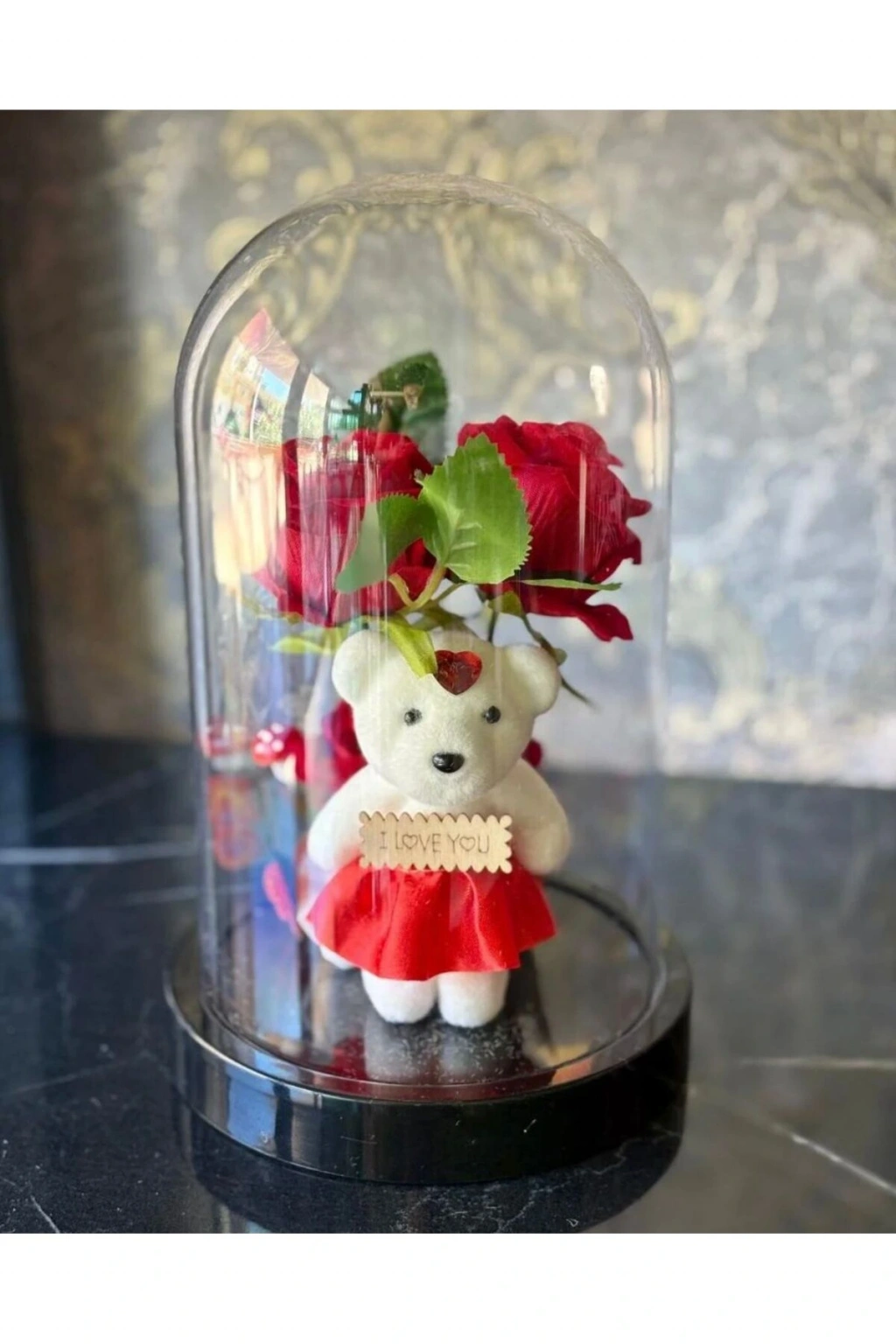 - Türkiye menşeli, yerel üretim güvencesiyle sunulan fanus içi gül ve ayıcık dekorasyonu.; - LED ışıklarla aydınlatılan bu dekorasyon, evinizin atmosferini sıcak ve romantik bir hale getirir.; - Renk seçeneği olarak undefined ile, mekanınıza uyum sağlayacak zarif bir görünüm sunar.;