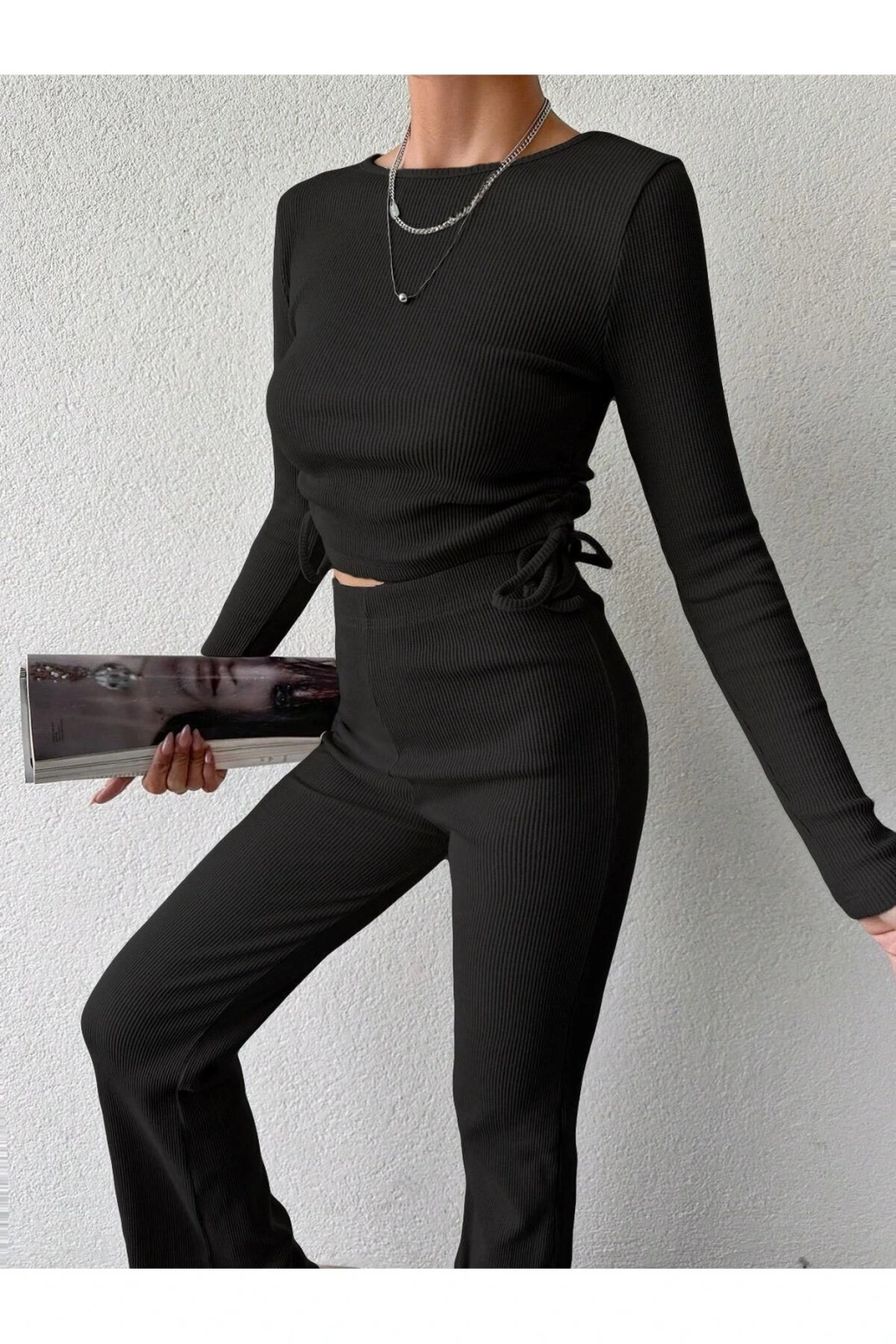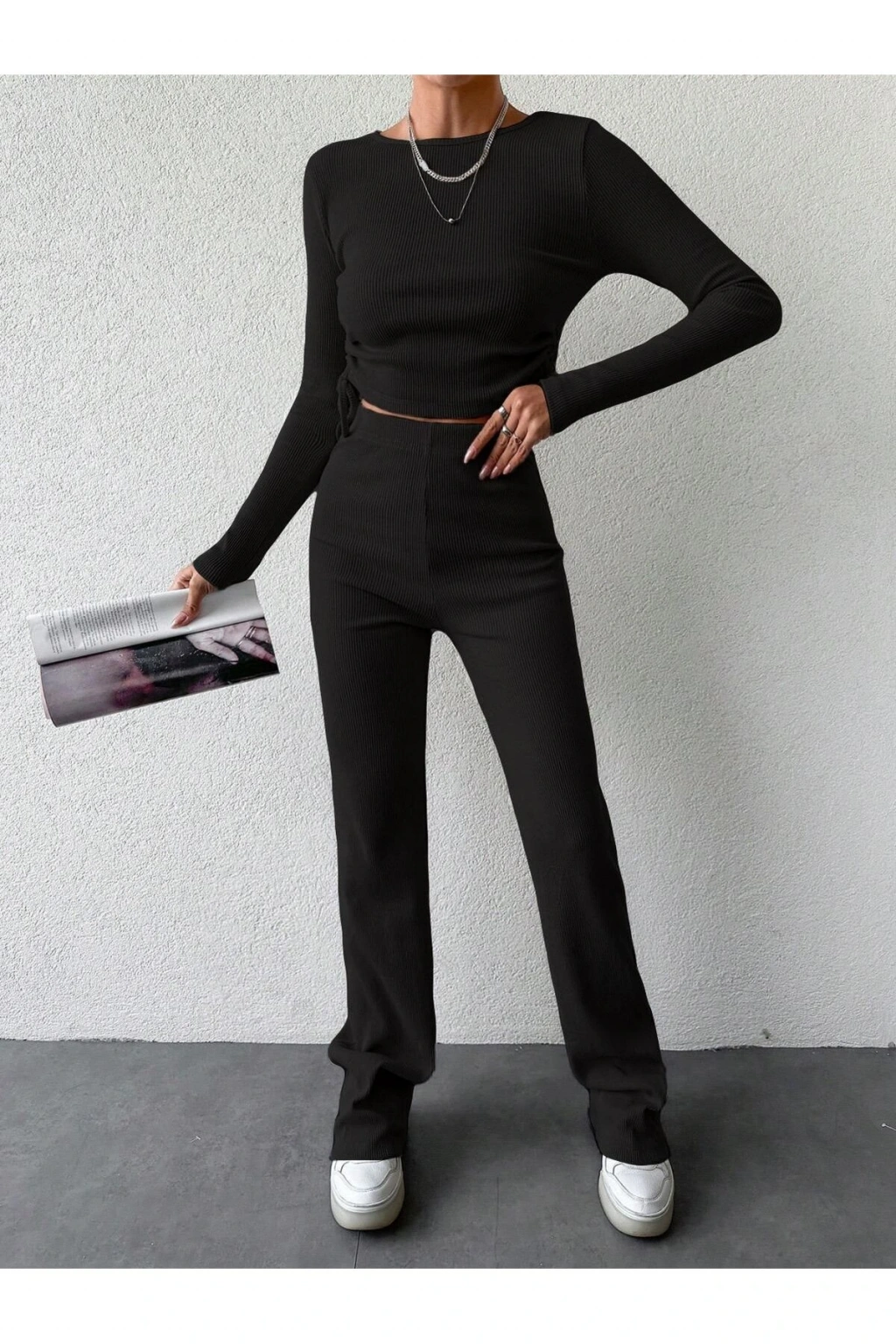 - Rahat kesimiyle günlük kullanım için ideal, normal bel yüksekliğindeki HİMENİSA kadın crop bluz.; - Şıklığı konforla buluşturan ispanyol paça pantolon, her türlü kombininize uyum sağlar.; - Bisiklet yakası sayesinde rahat bir giyim deneyimi sunar; hem spor hem de şık görünüm elde etmenizi sağlar.; - Paket içeriğinde yer alan tek parça ile minimalist tarzınızı yansıtırken ekstra parçalarla da çeşitlilik kazanabilirsiniz.; - Cepsiz tasarımıyla modern ve sade bir stil oluştururken, kolaylıkla farklı aksesuarlarla kişiselleştirilebilir.; - Orta kalınlığa sahip kaşkorse dokusuyla mevsim geçişlerinde ideal sıcaklık dengesi sunar.; - Astar gerektirmeyen yapısı sayesinde pratik kullanım imkanı tanır; zamandan tasarruf ederken aynı zamanda şıklığınızdan ödün vermezsiniz.; - Beli lastikli tasarımının getirdiği esneklikle gün boyu konforun tadını çıkarırken vücut hatlarınıza mükemmel uyum sağlayacak slim fit kesime sahiptir.; - Örme kumaşı dayanıklılığı arttırarak uzun süreli kullanıma olanak tanıyan bu takım, tüm sezonlarda tercih edebileceğiniz vazgeçilmez gardrobunuzdaki yerini alacaktır.; Sade deseniyle her tür üst veya alt giysiye kolayca adapte olabilen bu modellere yetişkin yaş grubuna hitap ederek geniş kullanıcı kitlesine erişebilmektedir Trend anlayışına uygun olarak dizaynı yapılan bu ürüne eşlik edecek diğer parçalar arasında ise çok sayıda seçenek bulunmakta olup böylece daha fazla zevke hitap etmek mümkündür.