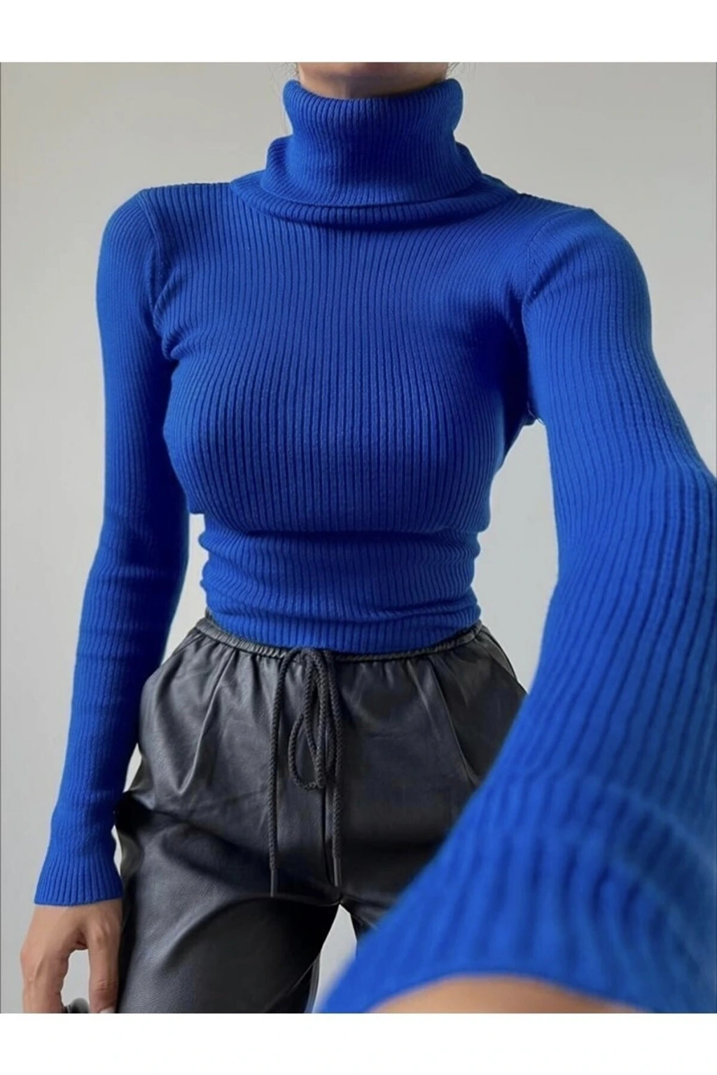 Kadın Mavi Pamuklu Balıkçı Yaka Şardonlu Slimfit Boğazlı Kazak Fitilli Bady