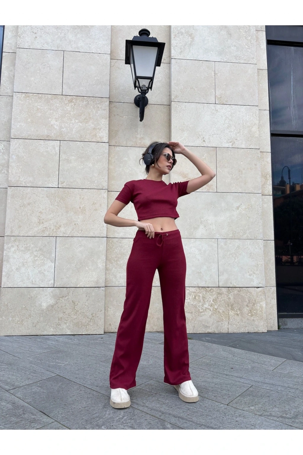 Kadın KIsa Kol Crop Yüksek Bel Bol Paça Kaşkorse Takım