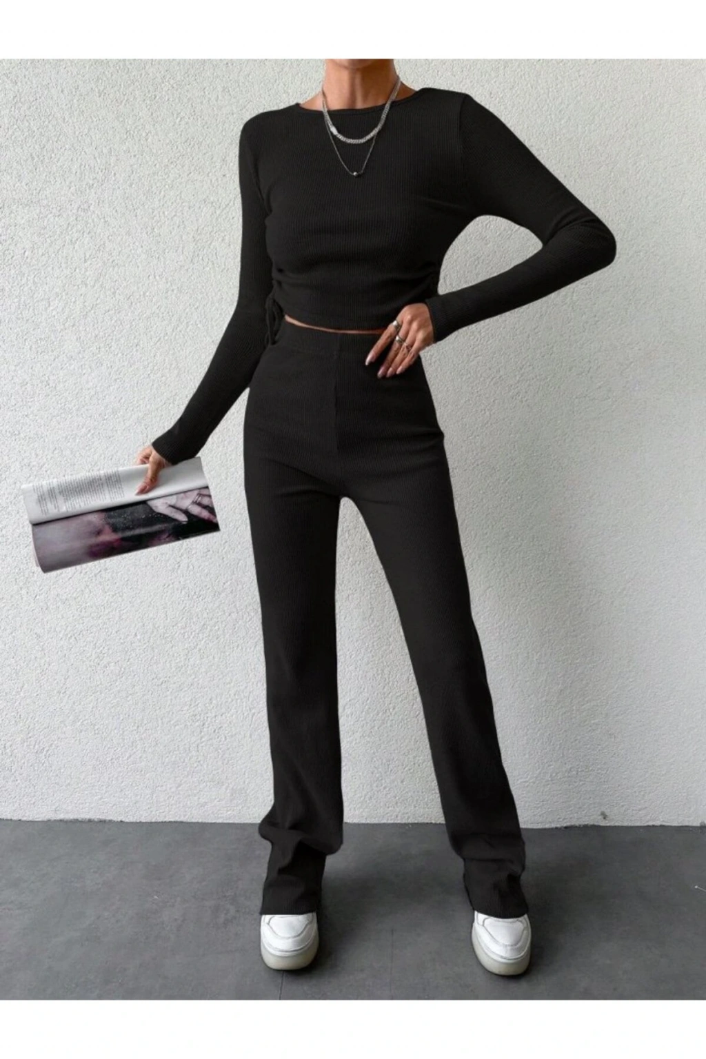 Kadın Uzun Kollu Bisiklet Yaka Yanları Asansör Büzgü Detay Bluz Ve Yüksek Bel Kaşkorse Kumaş Pantolon Ikili Takım