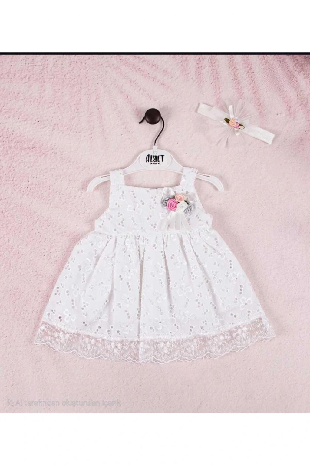 - Zarif beyaz rengiyle dikkat çeken bu elbise, kız bebeklerin özel günlerinde şıklığını tamamlar.; - Standart boy tasarımı ile her bedene uygun rahatlık sunar.; - Cepsiz yapısı sayesinde sade ve şık bir görünüm sağlar.; - Askılı kol boyu, yaz ayları için ideal konforu sunarken, tül kumaşıyla hafifliği hissettirir.; - Kloş siluetiyle hareket özgürlüğü sağlar ve her adımda zarafeti ön plana çıkarır.; - Parti ortamları için idealdir; hem eğlenceli hem de göz alıcı bir stil yaratır.; - Sürdürülebilirlik detayı bulunmadığından üretim sürecinde çevreye duyarlılık gösterilmez.; - Kare yaka tasarımı ile feminen çizgiler ön plana çıkarken, dantel dokuma tipiyle sofistike bir hava katılır.; - Regular kalıp sayesinde rahatlıkla giyilip çıkarılabilir; bebekler için konforlu bir kullanım sunar.; - Astarlı yapısı ile iç göstermez ve tam koruma sağlar.; - Tül materyali sayesinde hafiflik hissi verirken dayanıklılığı arttırır.; - 12-18 ay bedeniyle yeni doğanlardan küçük çocuklara kadar geniş yaş aralığına hitap eder.; - Type 1 yıkama talimatına uygun şekilde temizlenmesi pratiklik kazandırır.; - Nakışlı / işlemeli deseniyle göz alıcı detaylar eklerken, kemersiz oluşu minimalizmi vurgular.; - Türkiye menşeli olması yerel üretim tercihini desteklerken, kaliteli malzemelerle işçilik sergiler.