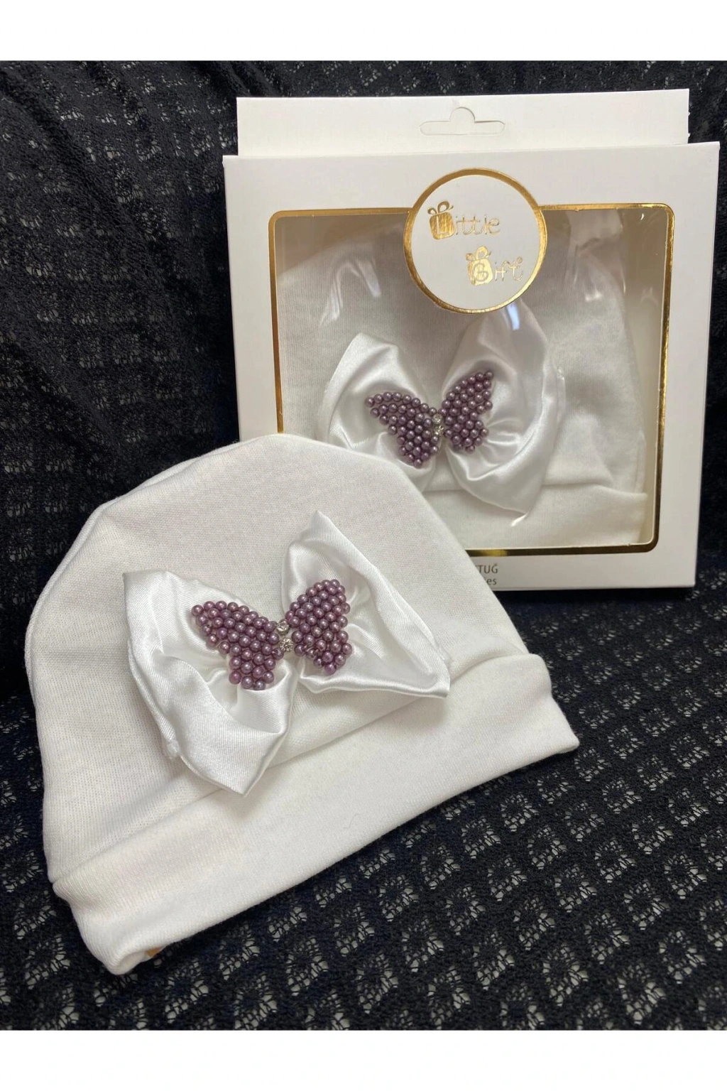 Pamuklu Şık ve Rahat Papyon Nakışlı Tasarım Bebek Beresi