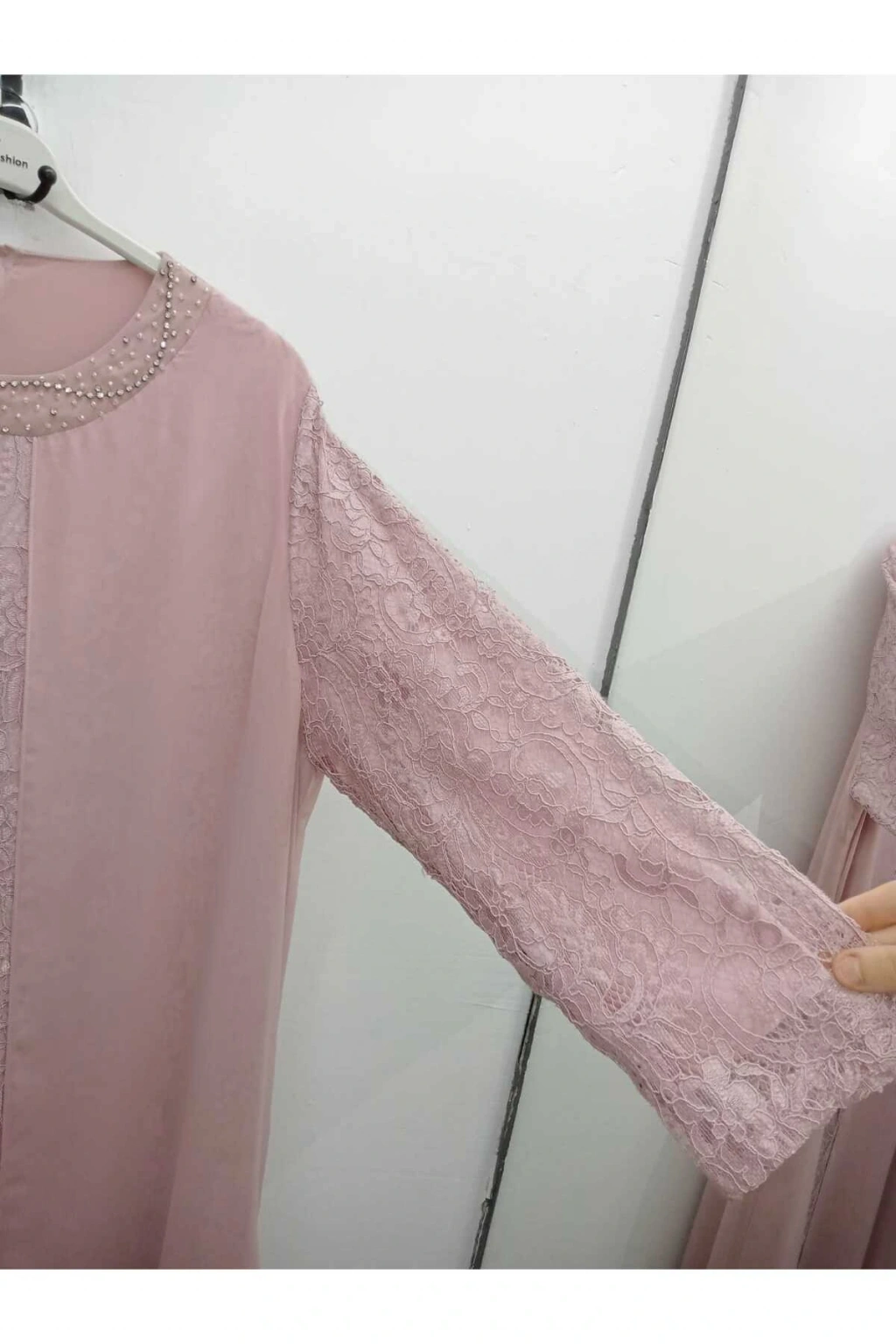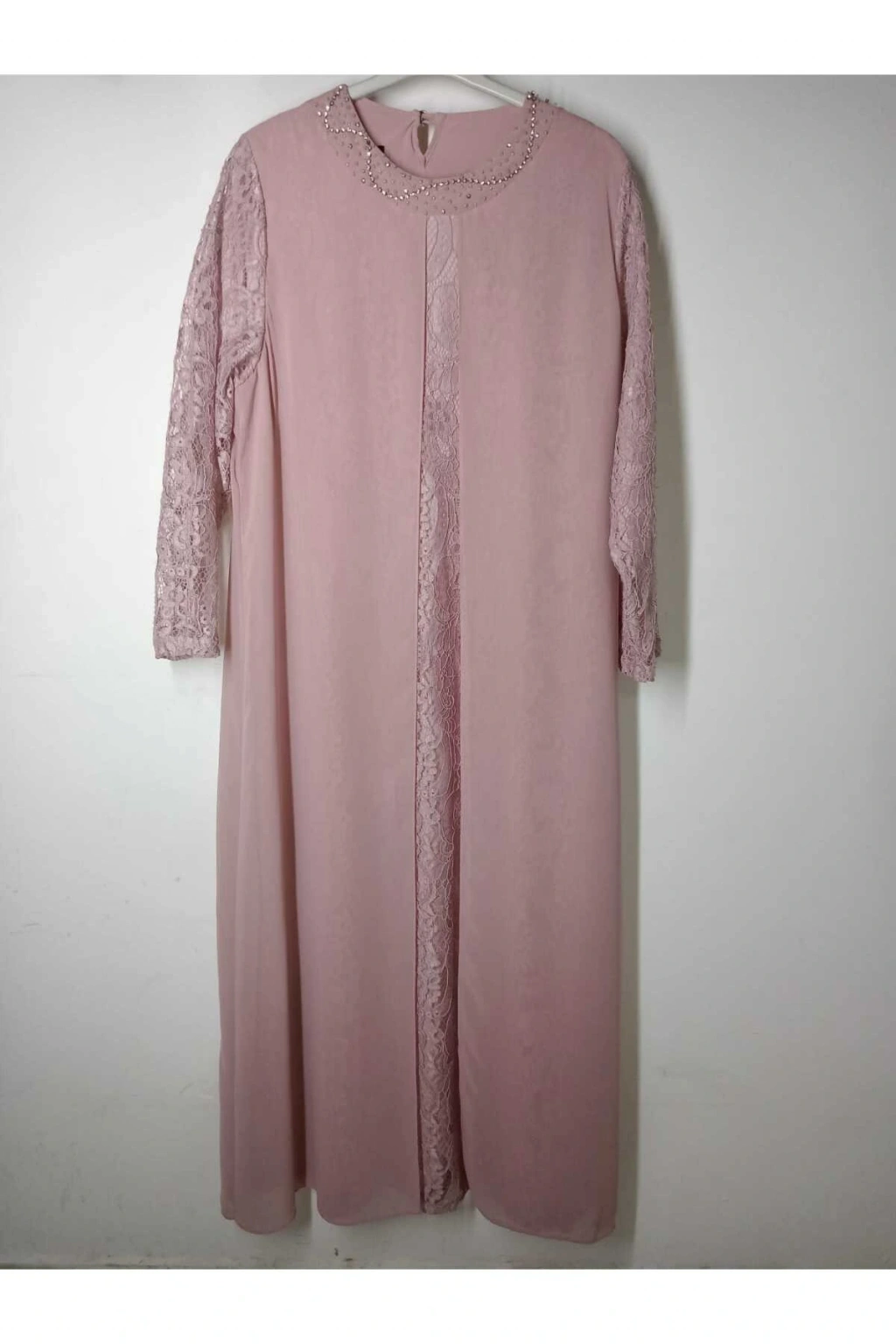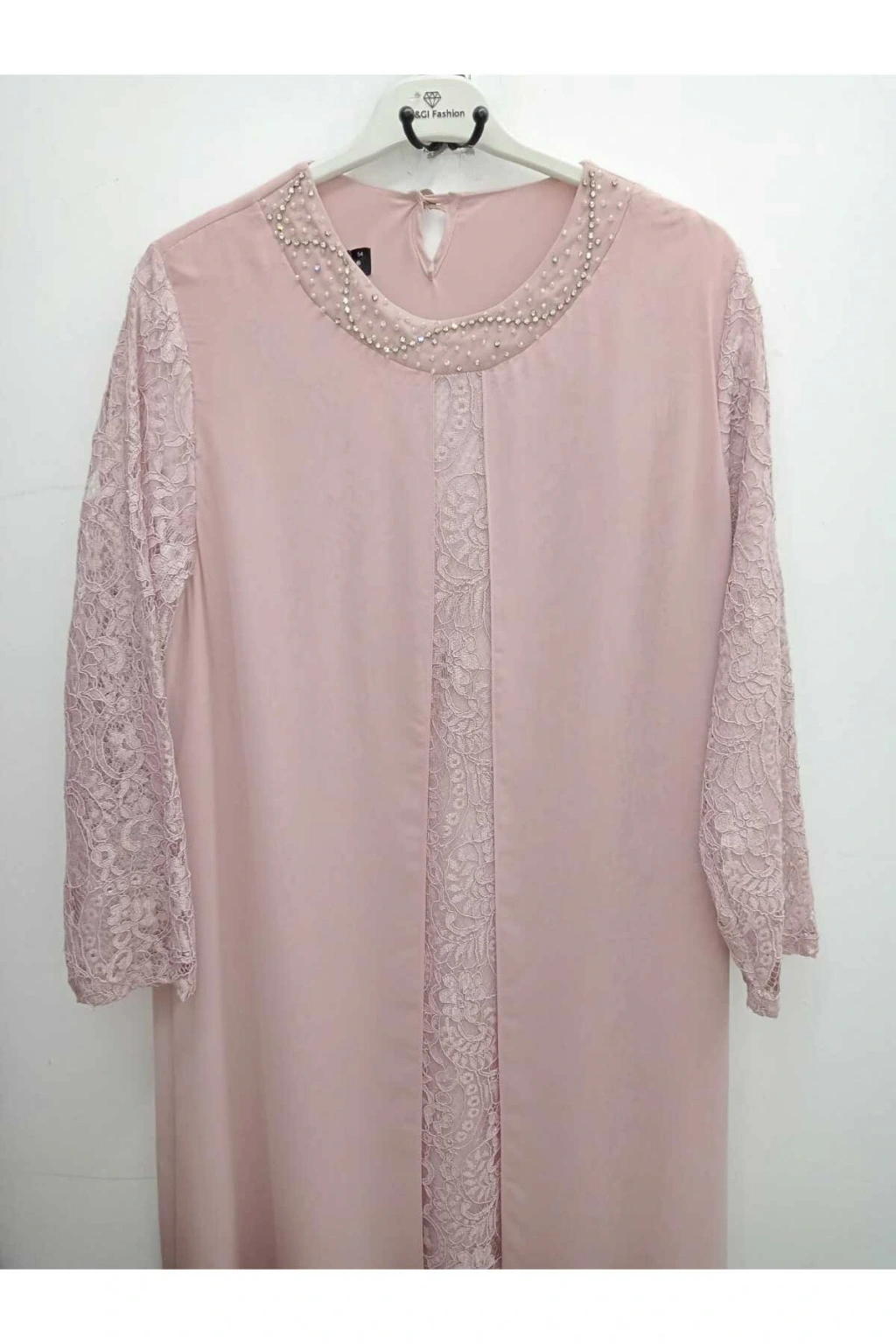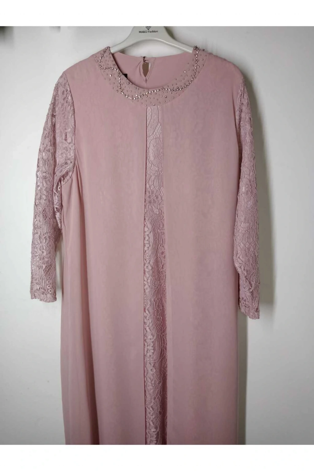 PEMBE ŞIK TAŞ İŞLEMELİ BÜYÜK BEDEN ANNE ABİYE ELBİSE