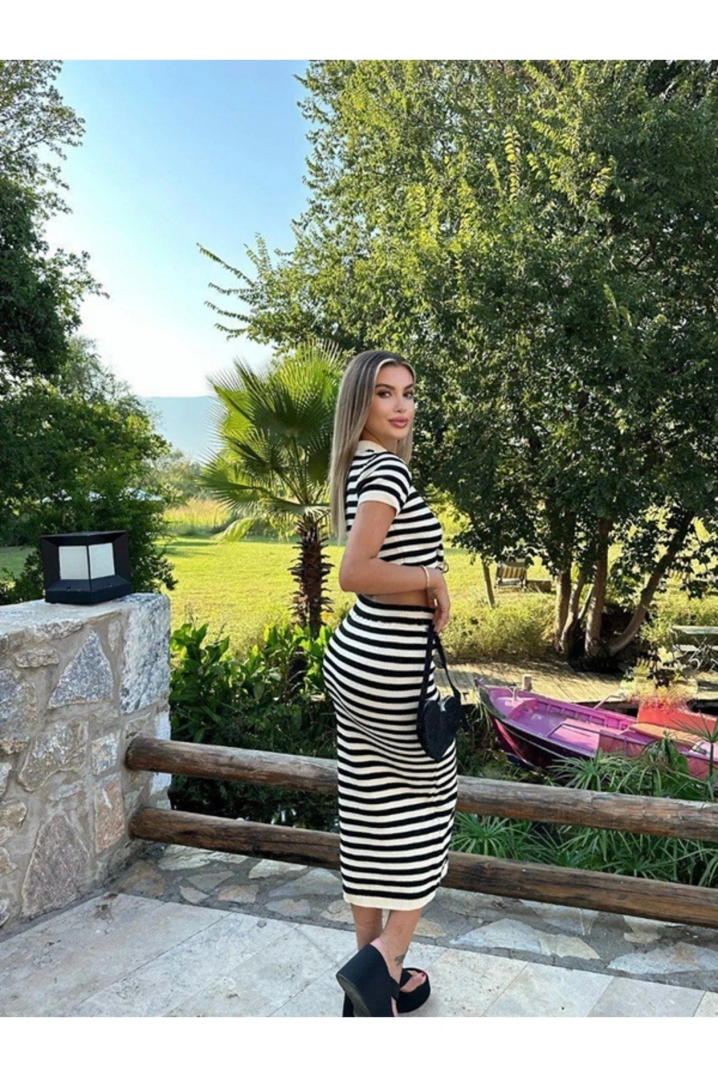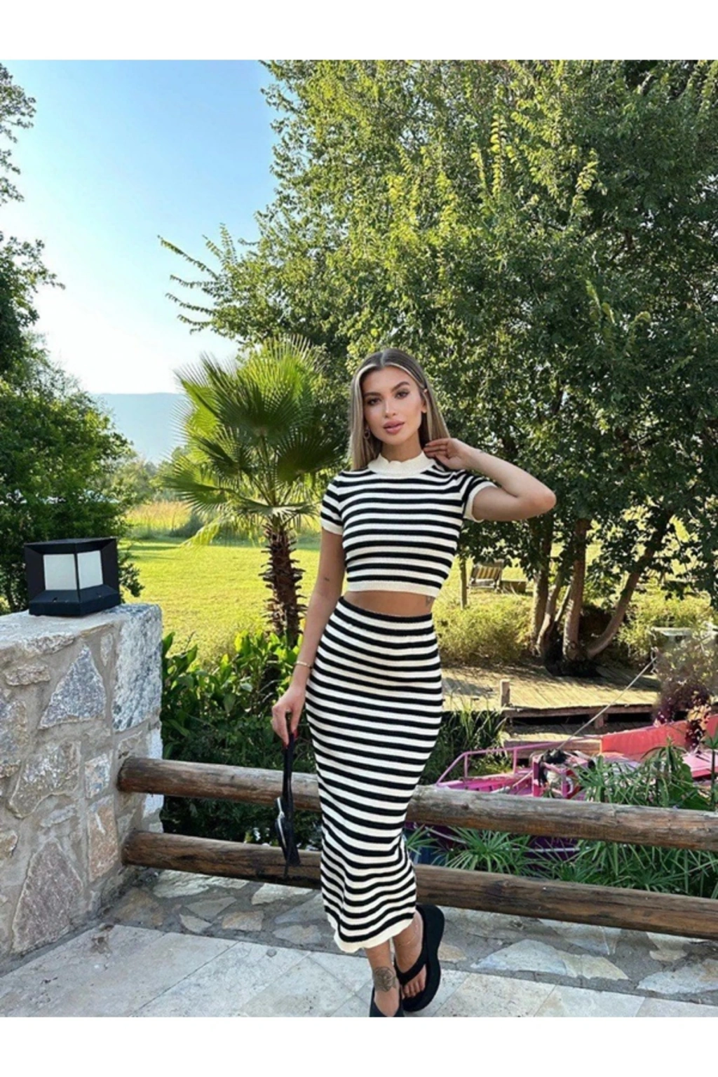 Triko kumaşı sayesinde yumuşak dokusuyla konforlu bir kullanım sunar.; Akrilik materyali, dayanıklılığı artırırken esnek yapısıyla hareket özgürlüğünüzü kısıtlamaz.; Slim kalıbı ile vücut hatlarınıza mükemmel uyum sağlar, şık ve modern bir siluet çizer.; Bisiklet yaka tasarımı, sade ve zarif bir görünüm kazandırırken günlük kullanım için idealdir.; Çizgili deseniyle zamansız bir stil oluşturarak her ortamda kolayca kombinlenebilir.; Crop boy eteği sayesinde trendleri takip ederken rahatlık hissini de korursunuz.; Bluz-etek alt üst takımı olarak tasarlanmış olup, pratik giyim deneyimi sunar.; Casual/günlük ortamlarda rahatlıkla tercih edebileceğiniz bu takım, tüm yaş gruplarına hitap eder.; Kısa kollu bluz parçası yaz aylarında serinlik sağlarken, kombinlerinizi tamamlayıcı unsurlardan biri olur.;