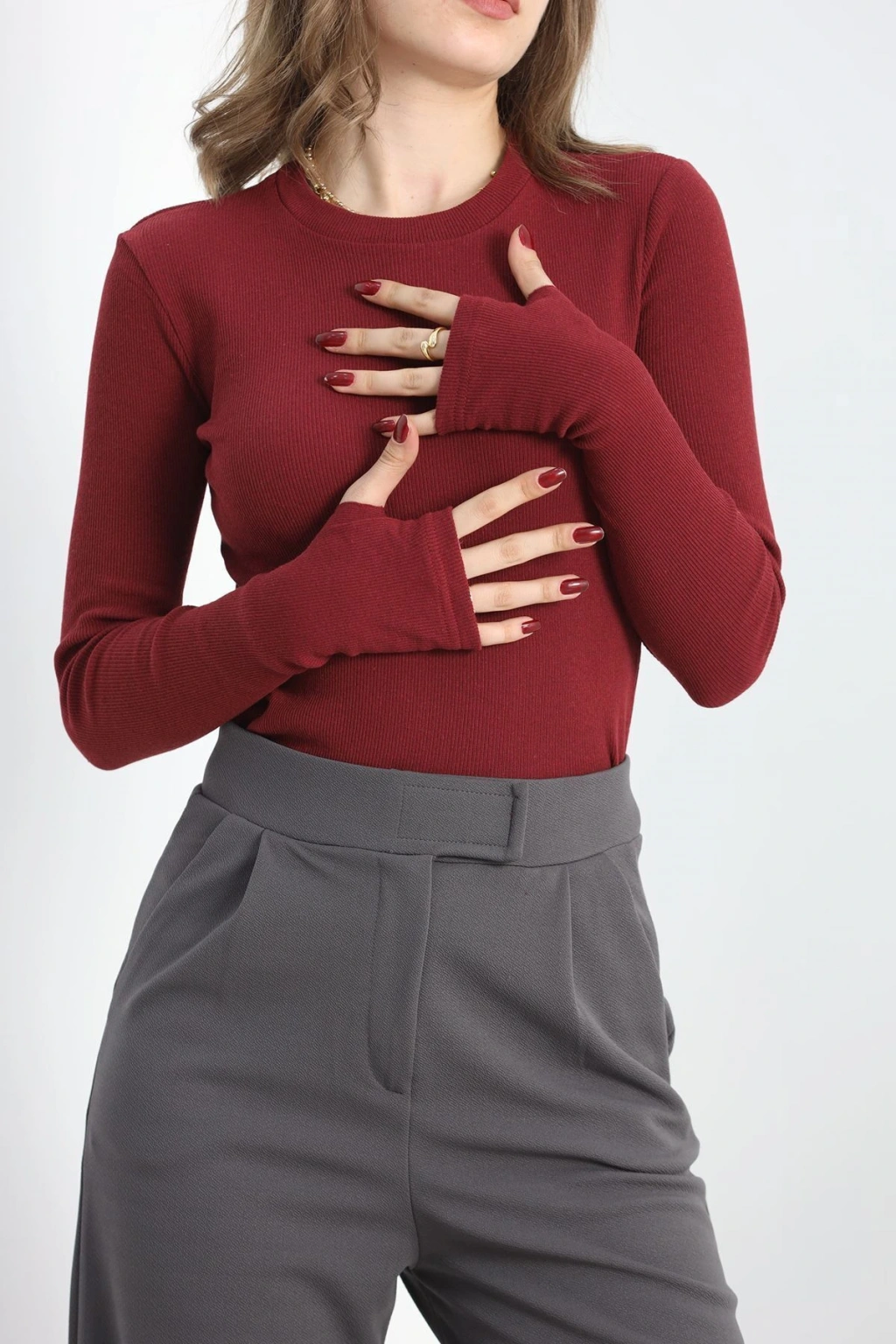 Kare Yaka Uzun Kollu Crop Bluz, Parmak Geçmeli