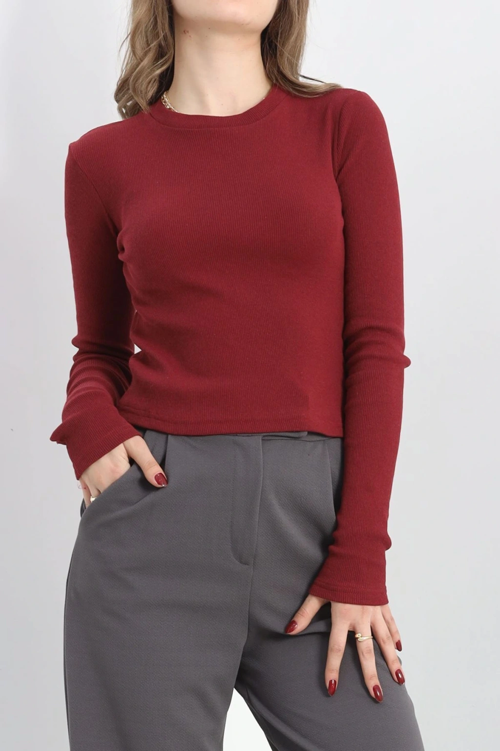 Kadın Dikişsiz Örme Fitilli Uzun Kollu Kare Yaka Crop Bluz 9010